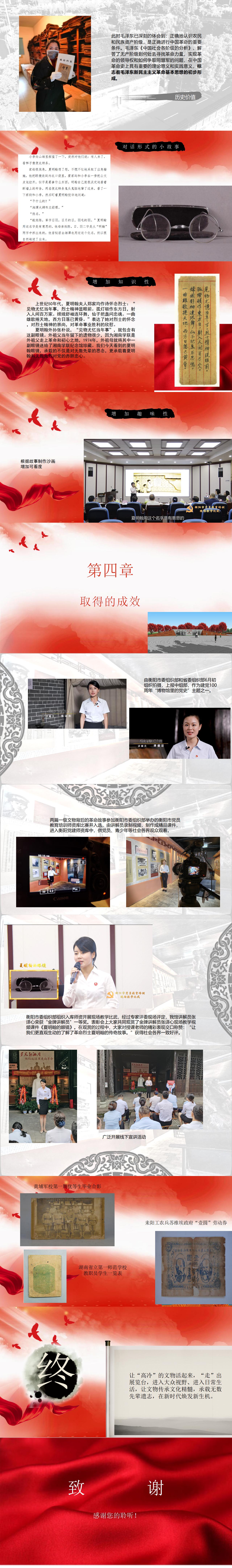 7月至9月,两篇一级文物背后的革命故事参加衡阳市委组织部举办的衡阳市党员教育培训师资库比赛并入选,制作成精品课件,进入衡阳党建师资库中,供党员、青少年等社会各界观众观看。